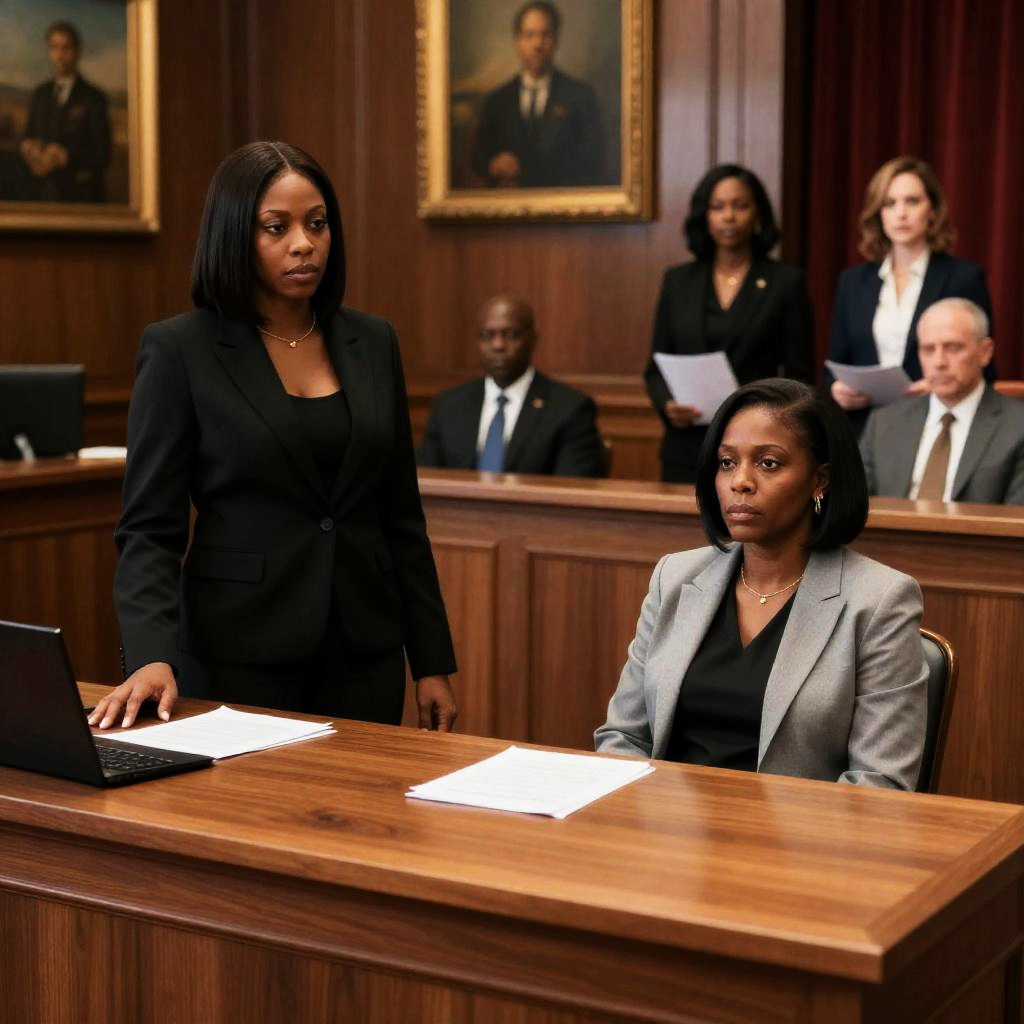 Photograph of a courtroom. Black woman with long hair, black blazer, and black pants stands behind a wooden desk with papers. Black woman with short hair, gray blazer, and black top sits at the desk. Two men in suits with serious expressions sit in the background. Two women in professional attire stand behind them, holding papers. Dark wood-paneled walls, framed paintings, and red curtains in the background.