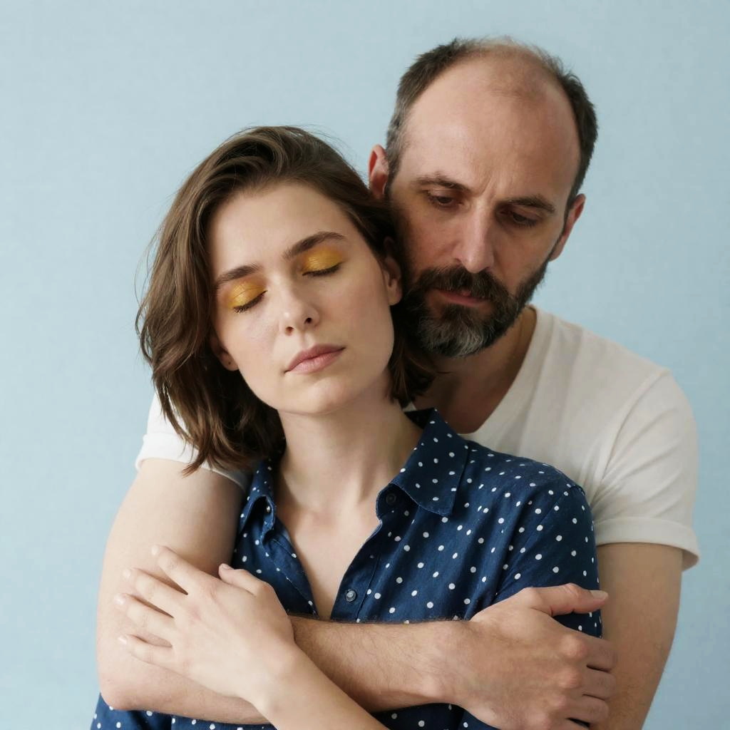 Photograph of a man and woman in a close embrace. Woman with short brown hair, closed eyes, and yellow eyeshadow, wearing a blue polka-dot shirt. Man with receding hairline, beard, and serious expression, wearing a white top, hugging her from behind. Light blue wall in background. Soft natural light. Man's head rests on woman's shoulder. Both have neutral expressions.