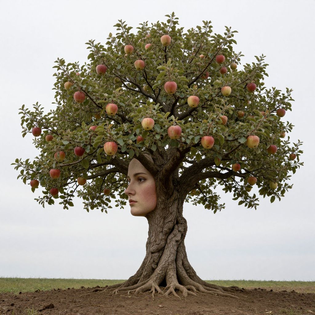 A surreal tree emerges from the earth, its gnarled trunk seamlessly merging into a woman's face, while its branches sprout apples bearing identical human visages, creating a hauntingly intimate connection between nature and humanity.