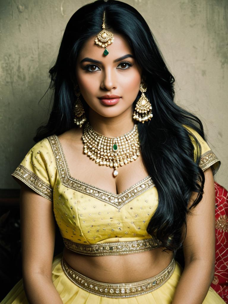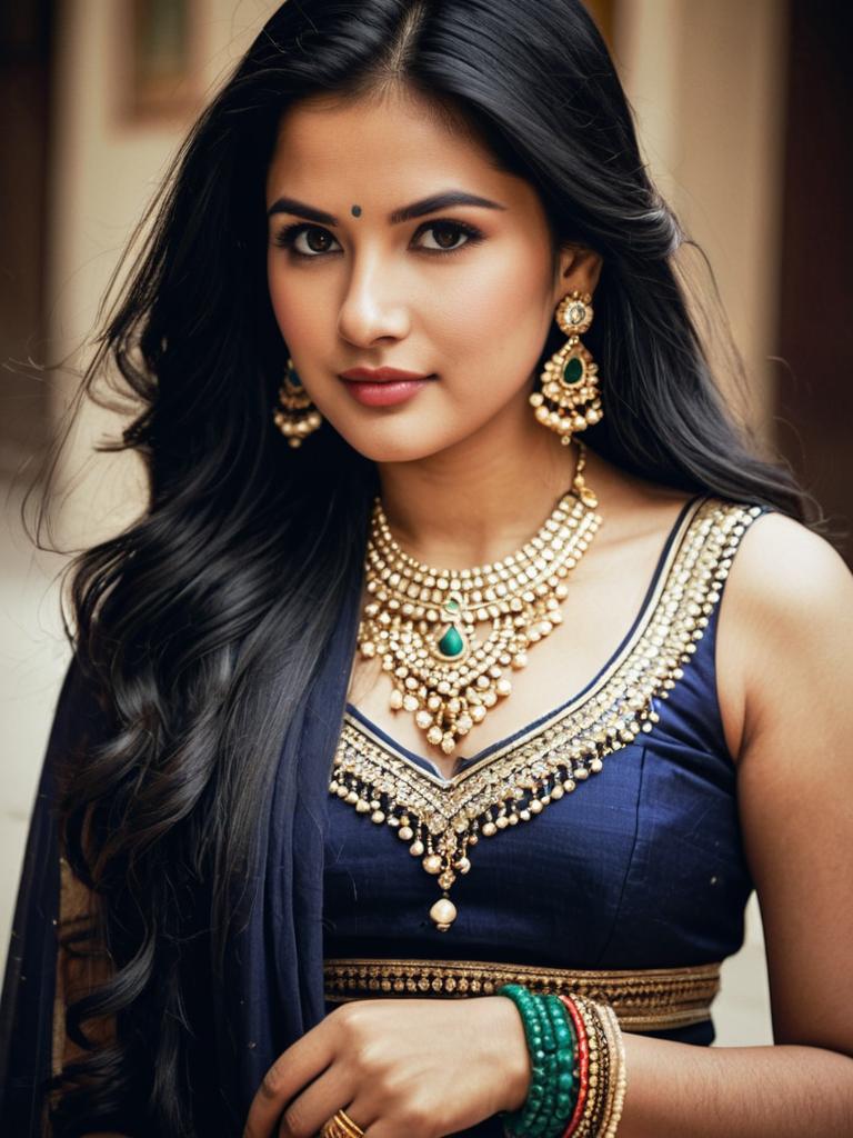 Rajasthani ghagra choli, 1girl, solo, jewelry, dress, long hair, earrings, looking at viewer, black hair, smile, bracelet, pink dress, necklace