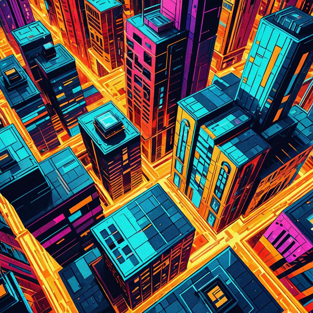 Vibrant abstract digital artwork of futuristic cityscapes, dazzling colors, dynamic composition, digital cubism, vibrant, vivid tones, professional lighting