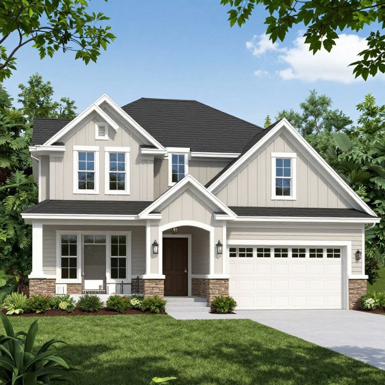Cottage-style house plan featuring a front elevation with three bedrooms, two baths, and 1,379 square feet, showcasing a symmetrical design with a central arched entryway flanked by two dormer windows, a garage on the right, and landscaping that includes shrubs, grass, and trees.