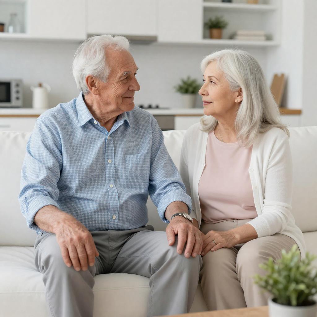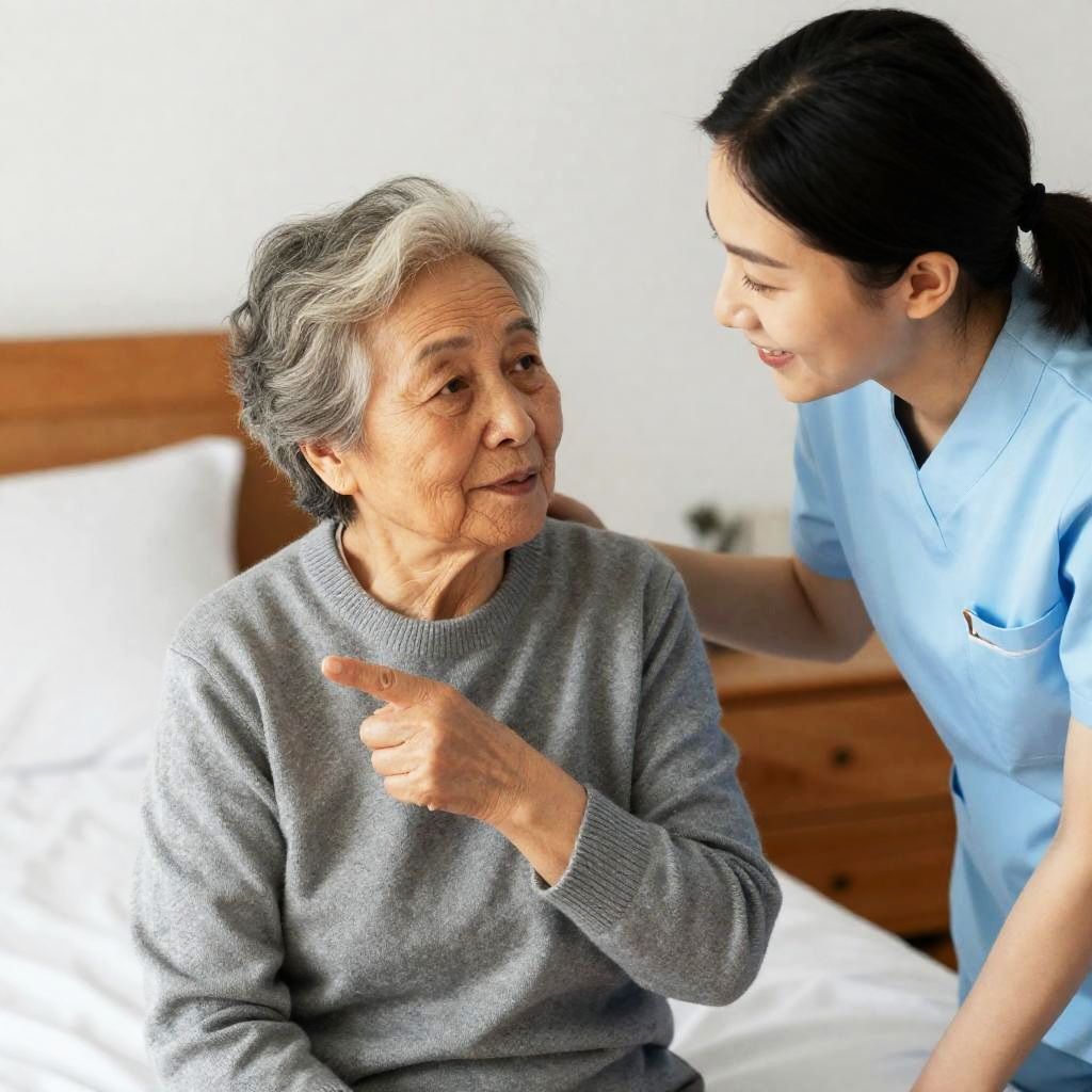 Photograph of two people in a sunlit garden. A woman with short brown hair, wearing a striped shirt and gray pants, kneels behind an older woman with gray hair, dressed in a light pink striped dress and brown shoes. The older woman sits on the grass, leaning back against the younger woman, who gently holds her face. Bright green bushes and sunlight create a serene background.