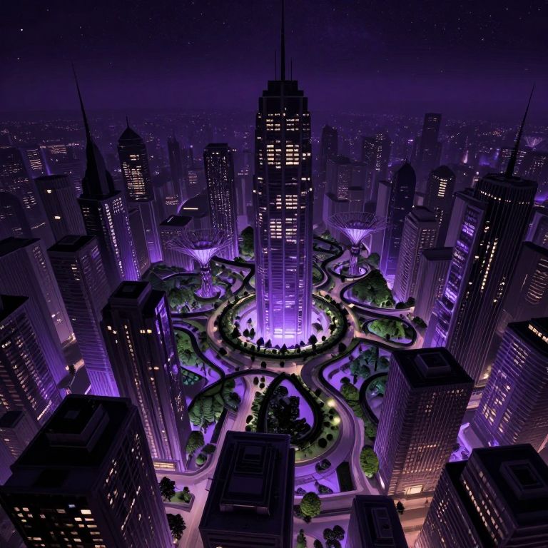 Digital CGI artwork depicting a futuristic, nighttime cityscape from an aerial perspective. The city is illuminated by vibrant purple and blue lights, casting a neon glow over tall, dark skyscrapers with numerous illuminated windows. Central to the image is a brightly lit circular plaza surrounded by winding roads and green tree clusters. The skyscrapers, featuring sleek, modern designs, surround the plaza, creating a dense urban environment. The background fades into a starry, purple-hued night sky, enhancing the futuristic atmosphere. The image combines elements of sci-fi and urban architecture, highlighting the contrast between dark silhouettes and luminous city lights.