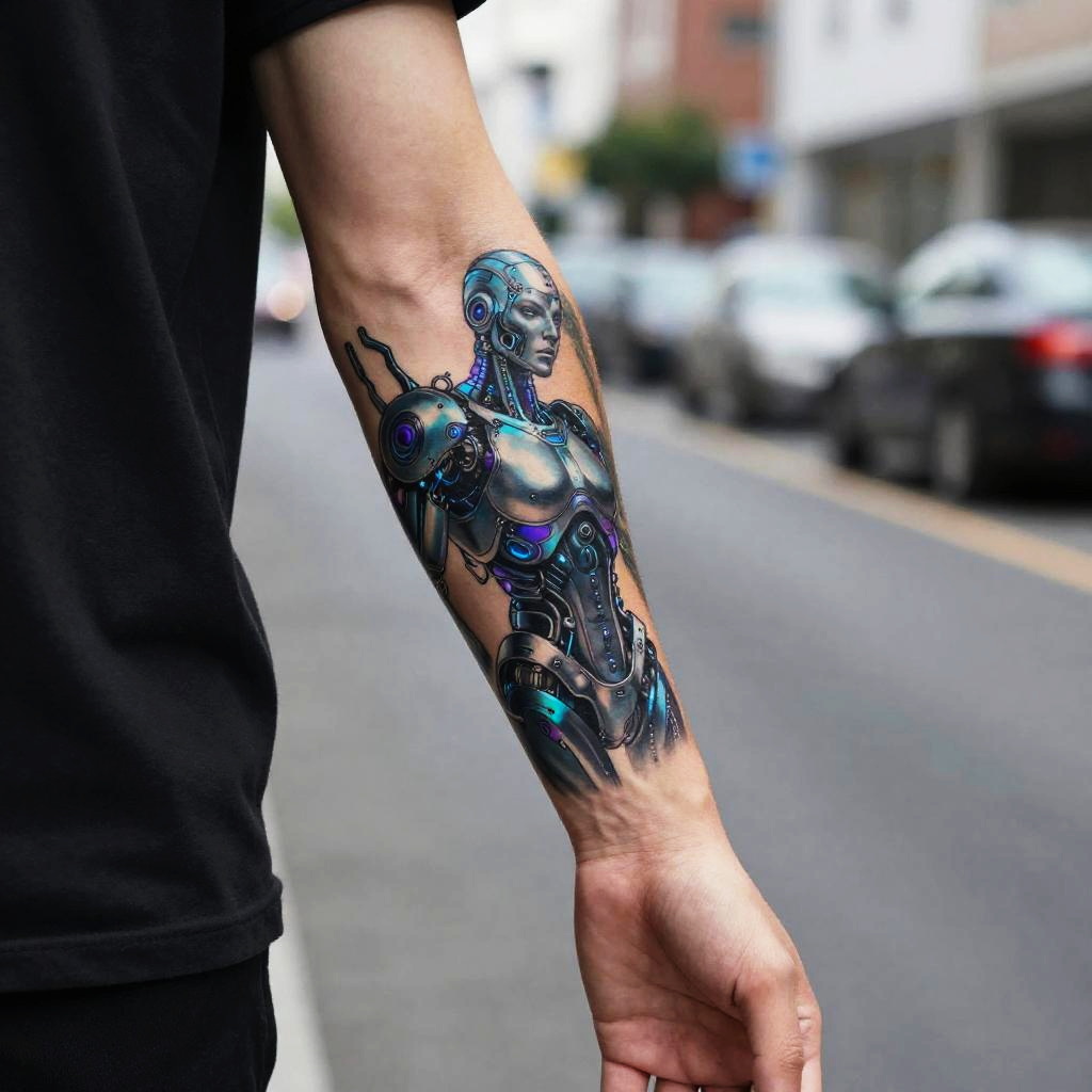 Add a tattoo to a photo, illustrating a futuristic cyberpunk biomechanical tattoo wrapping around a man's arm, neon blue and purple highlights, high detail with metallic textures and realistic skin blending in an urban environment.