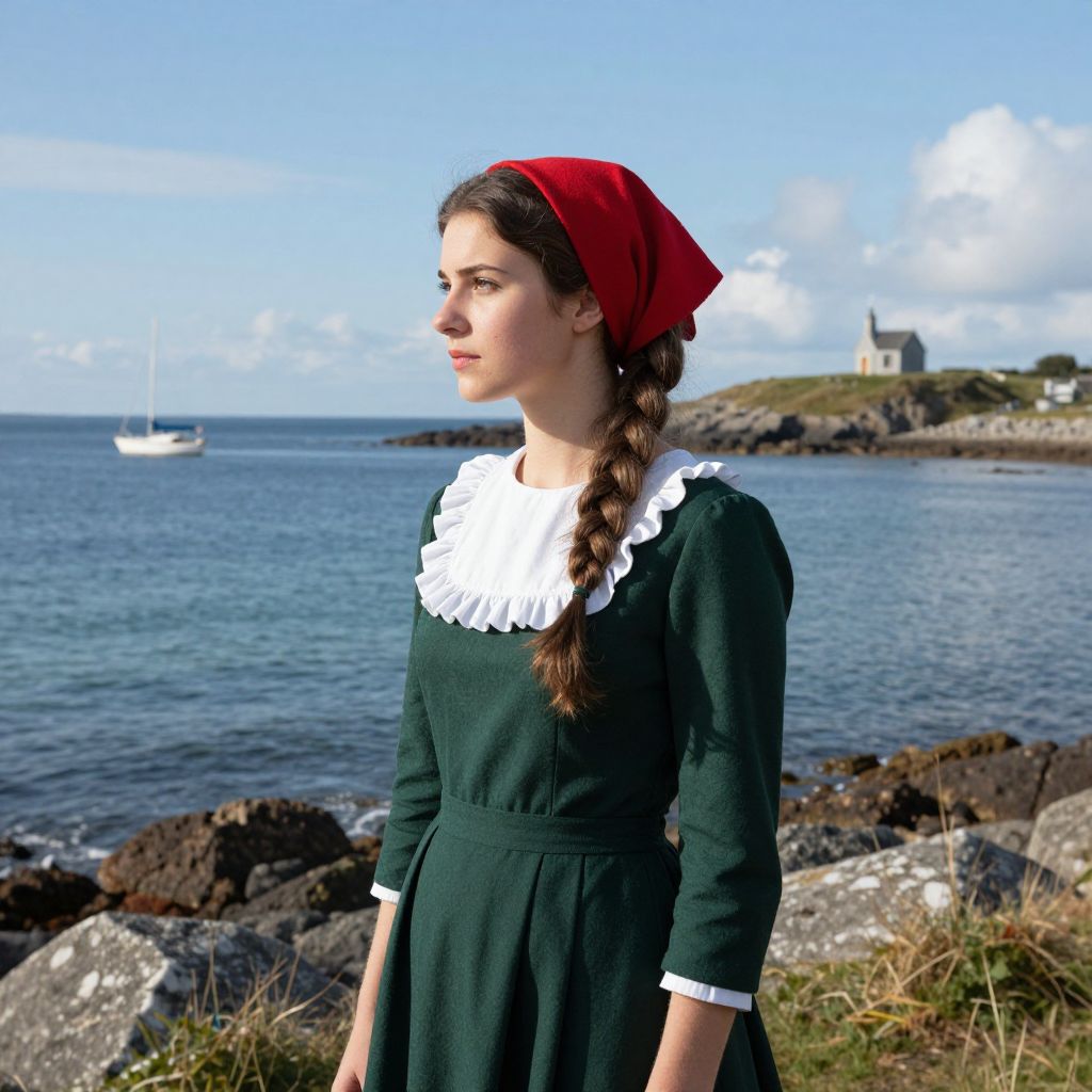 Young Breton woman depicted in a serene coastal landscape, wearing a dark green dress with a white ruffled collar and a vibrant red headscarf, her hair styled in an elegant braid, set against a backdrop of calm blue waters, distant sailboat, rocky shore, and a small chapel atop a hill under a clear sky with scattered clouds.