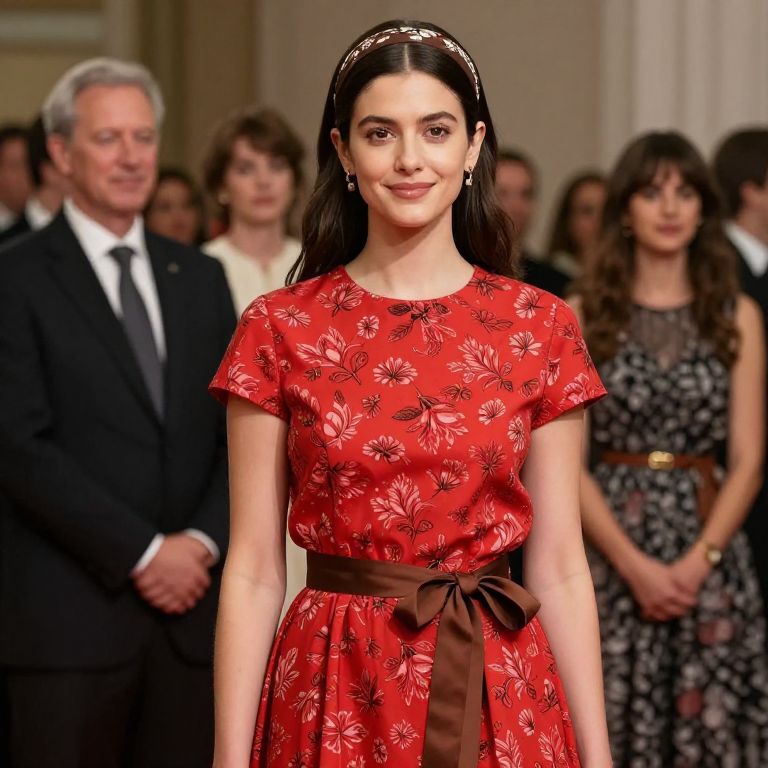 Female wearing a red dress with a floral pattern and a brown belt with a brown ribbon tied around the waist. She has a headband on her head and is wearing a pair of earrings. In the background, there are other people standing and looking at her.