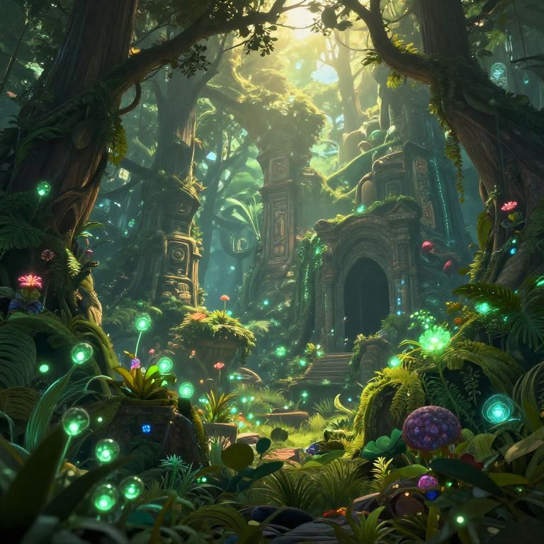 Fantasy forest scene with glowing mushrooms, bioluminescent orbs, and ancient ruins bathed in sunlight. Vivid colors, lush greenery,