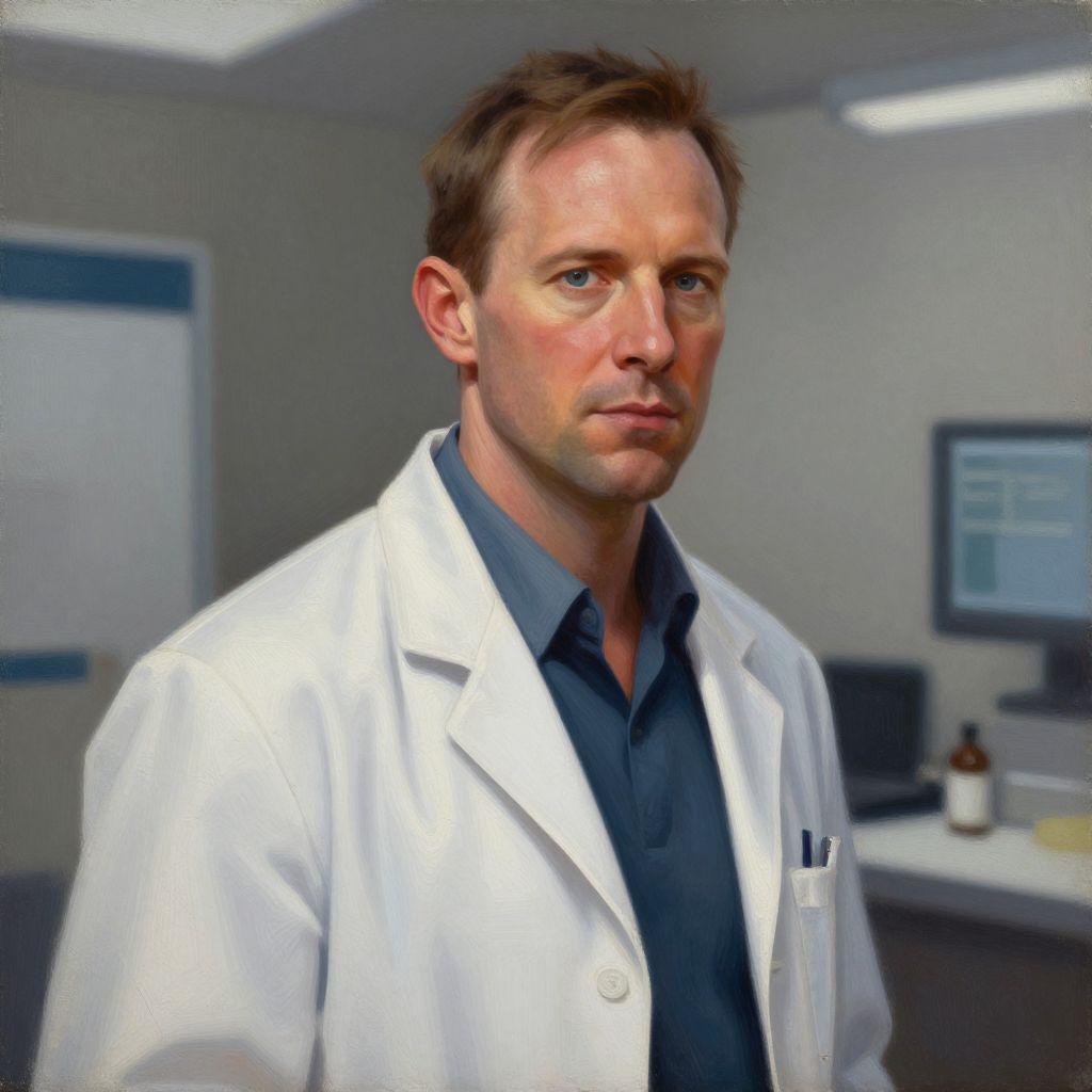 Photograph of a Caucasian man in his 30s with short, light brown hair and a clean-shaven face, standing in a clinical office. He wears a white lab coat over a dark blue button-up shirt, and a pen is visible in the left breast pocket of his coat. His expression is serious and slightly stern. The background features a blurred office setting with a whiteboard, computer monitor, and a small bottle on a desk. The lighting is bright and even, emphasizing the clinical environment. The image has a slightly enhanced, almost CGI-like effect.