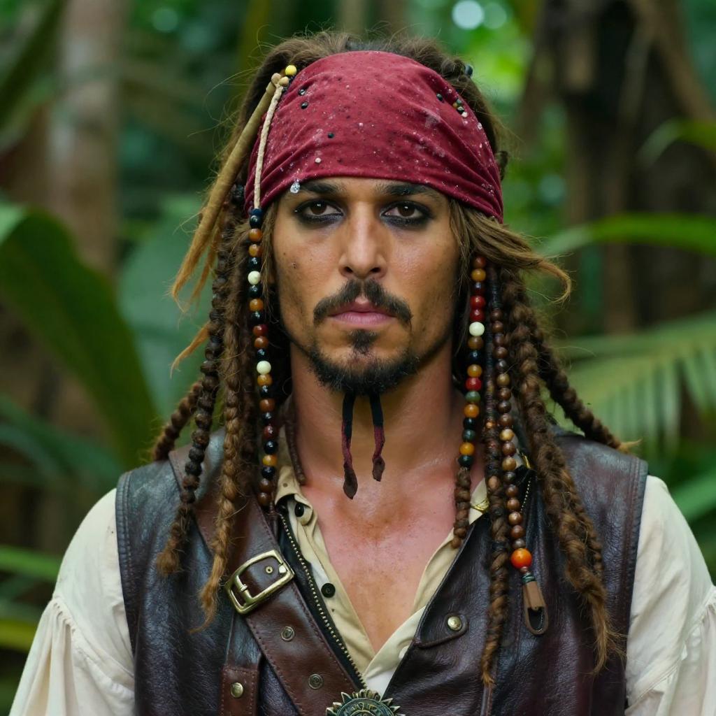 Close-up portrait of a rugged male pirate wearing a large black tricorn hat with gold trim, a red bandana, leather straps with brass buckles, and pearl earrings. He has a thick beard and mustache, intense blue eyes, long flowing hair, and is dressed in a dark leather pirate coat with detailed stitching and embellishments. The expression is fierce and determined.