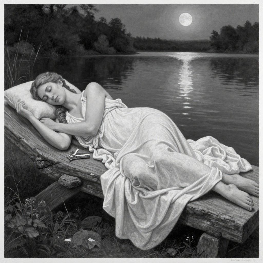 Black-and-white photograph of a sleeping woman in a white, flowing dress on a wooden log by a moonlit lake.