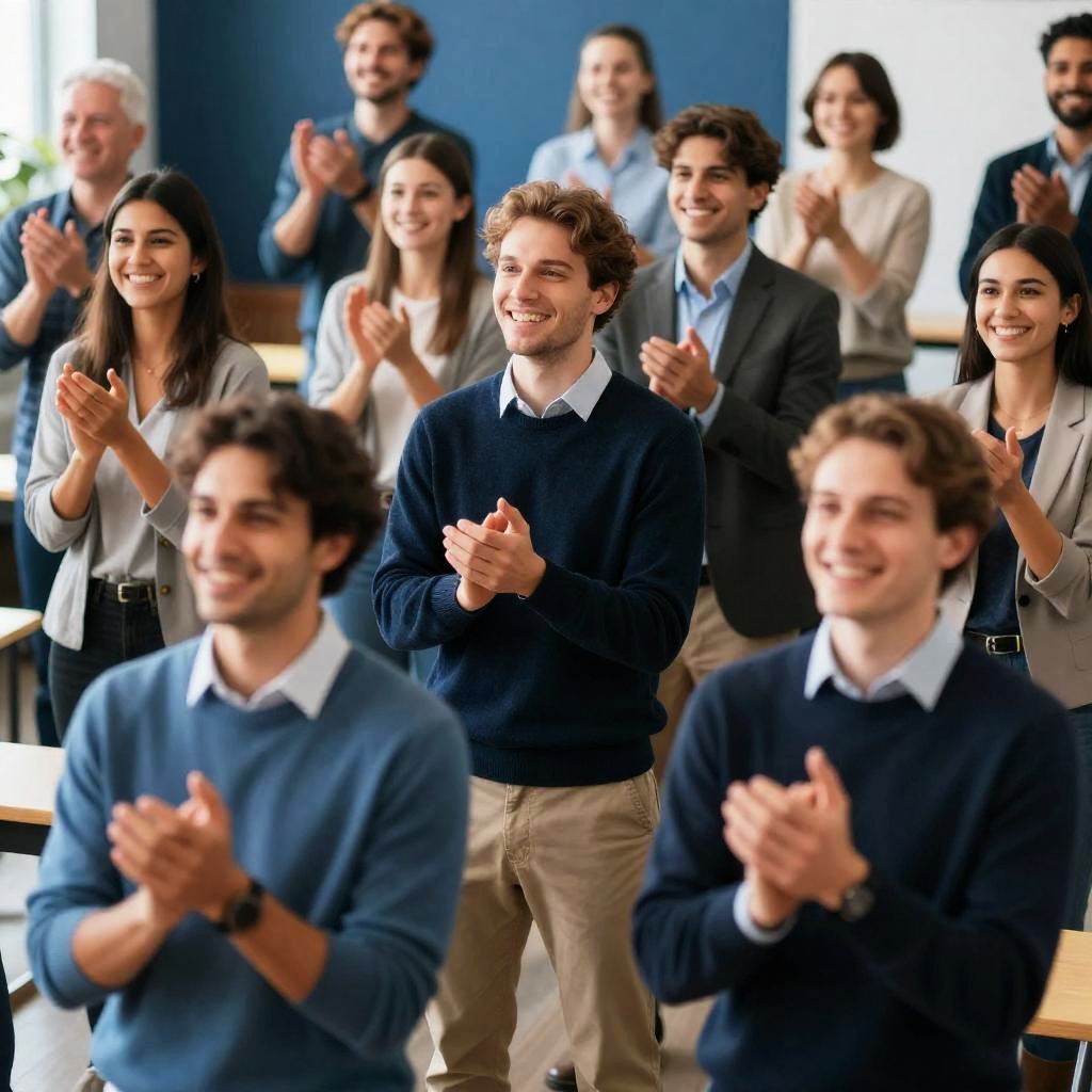 Photograph of six people seated in a row, clapping and smiling. Blonde woman with green top in center, red sweater woman to her left, dark-haired man to her left, brown-haired woman to her right, black-haired woman to far right. Dark wooden pews, dark doors in background. Warm indoor lighting.