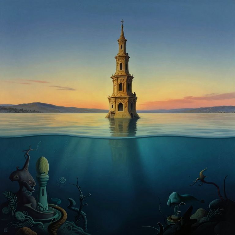 This digital artwork depicts a surreal scene with a tall, ornate church tower standing in the middle of a calm, reflective lake at sunset. The sky transitions from deep blue to warm orange and yellow hues near the horizon. Below the waterline, the scene is dark blue, with eerie underwater ruins and marine life, including a stylized, ancient stone column and ghostly fish. The church tower, illuminated by the sunset, creates a striking contrast between the serene above-water and mysterious below-water environments. The image blends realistic and fantastical elements, creating a dreamlike atmosphere.