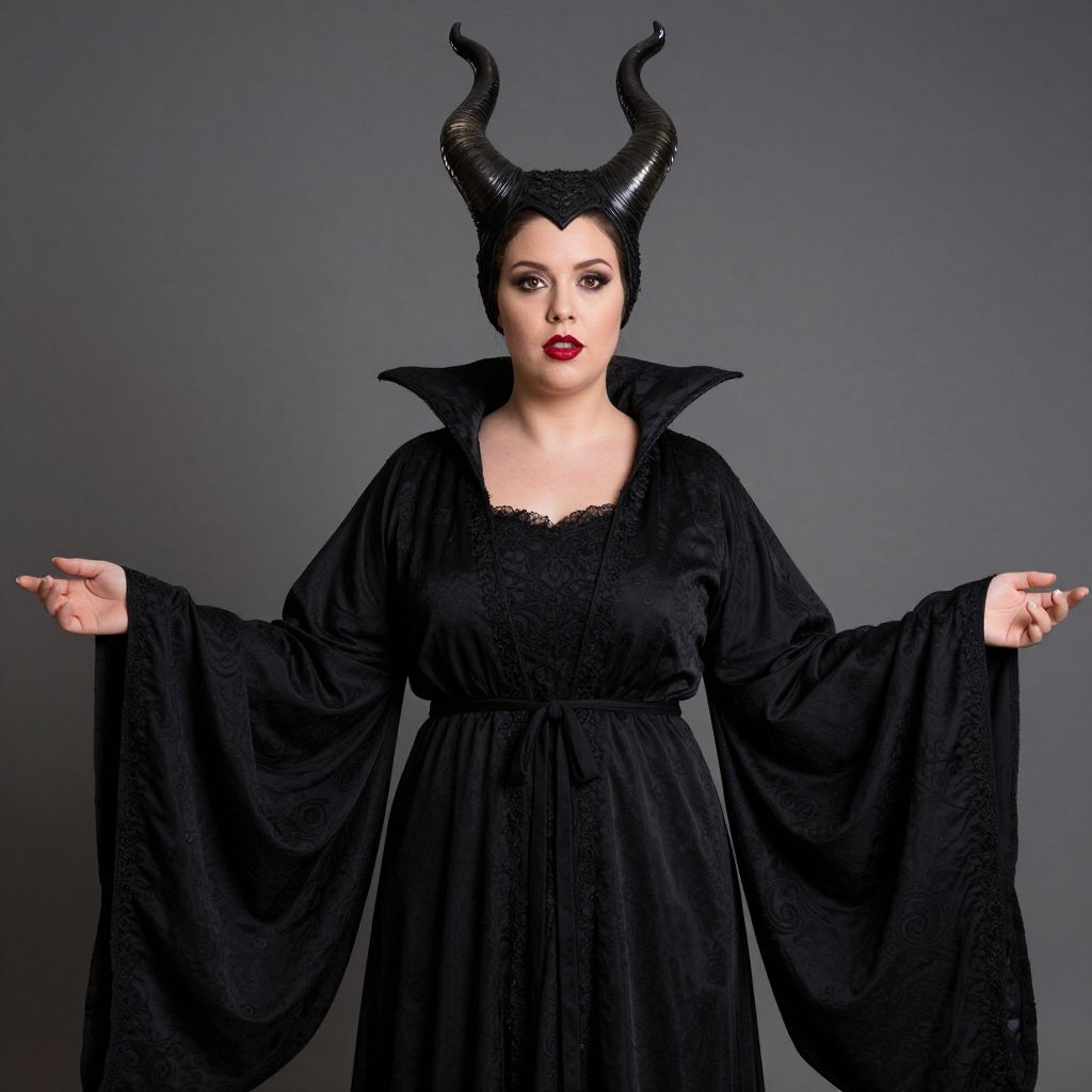 Plus size classic maleficent, 1girl, solo, horns, robe, red lips, fake horns, looking at viewer, wide sleeves, horned headwear, lipstick, realistic, black robe