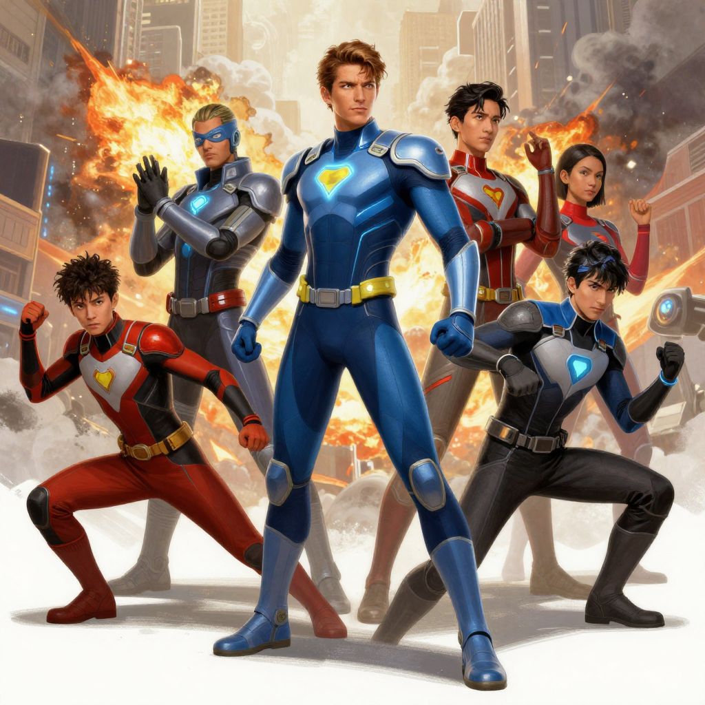 Superhero prompts featuring a team of diverse heroes in action poses, futuristic costumes with glowing accents, dramatic background of exploding buildings and smoke, vibrant color palette, dynamic composition showcasing teamwork and determination, digital painting style.