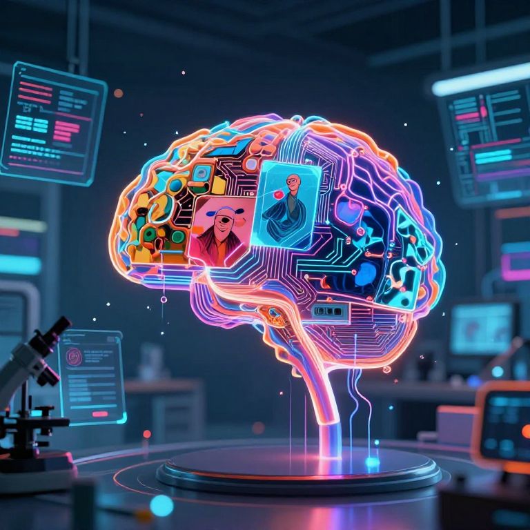 Neon-lit, digital brain hologram with circuit patterns floating in a futuristic lab, surrounded by glowing screens and high-tech equipment.