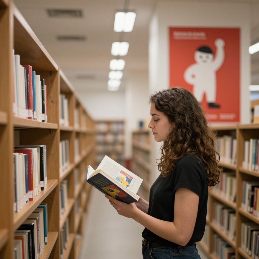 A woman stands amidst rows of wooden bookshelves, holding an open book with a vibrant illustration, as her gaze is drawn toward a striking red poster featuring a whimsical character, all under the soft glow of overhead lights in a serene library corridor.