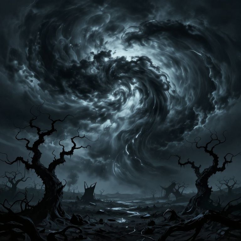 Digital art of a dark, swirling stormy sky over a desolate, treacherous landscape with twisted, leafless trees and eerie silhouettes