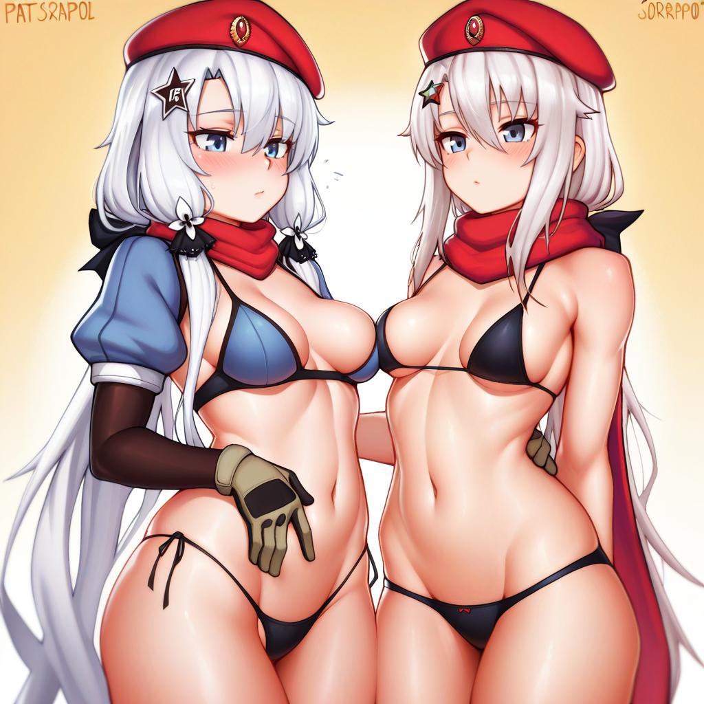 Digital artwork featuring two anime-style girls with long white and grey hair, blue eyes, and star hair ornaments. Both wear tactical-inspired short tops, black panties, and red scarves. One girl wears a red beret and a light blue top with pockets, while the other wears a darker sleeveless top with long gloves. The artwork is set against a softly lit background, highlighting the characters' expressive faces and detailed clothing.