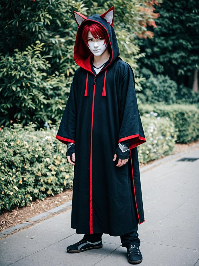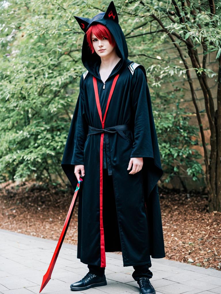 Photo-realistic cosplay photo of person in crystal exarch costume. Full body. Standing. Full length. 1boy, cat boy, cat ears, red eyes, hair between eyes, slit pupils, red hair, short hair, hooded robe, black robe, hooded robe, black robe, hood down, miqo'te, material growth, facial mark, crystal