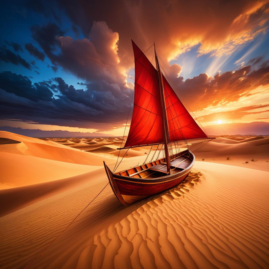 A detailed wooden boat with a large red sail resting on golden sand dunes in a vast desert under a dramatic sky at sunset, warm lighting highlighting the texture of the boat and sand, cinematic style with rich brown, orange, golden, and deep blue colors
