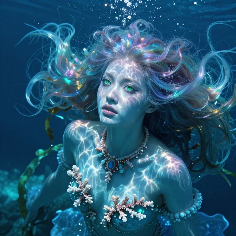 A captivating portrait of an elusive sea nymph with luminous azure skin and intricate coral jewelry, captured from above to showcase her ethereal beauty. Sunlight filters through crystalline waters, creating a mesmerizing kaleidoscope of shimmering hues across her translucent form, accentuating the iridescent sheen of her cascading hair, reminiscent of an underwater kelp forest. Her piercing emerald eyes gaze beyond, exuding longing and mystery, inviting viewers into the ocean's enigmatic depths.