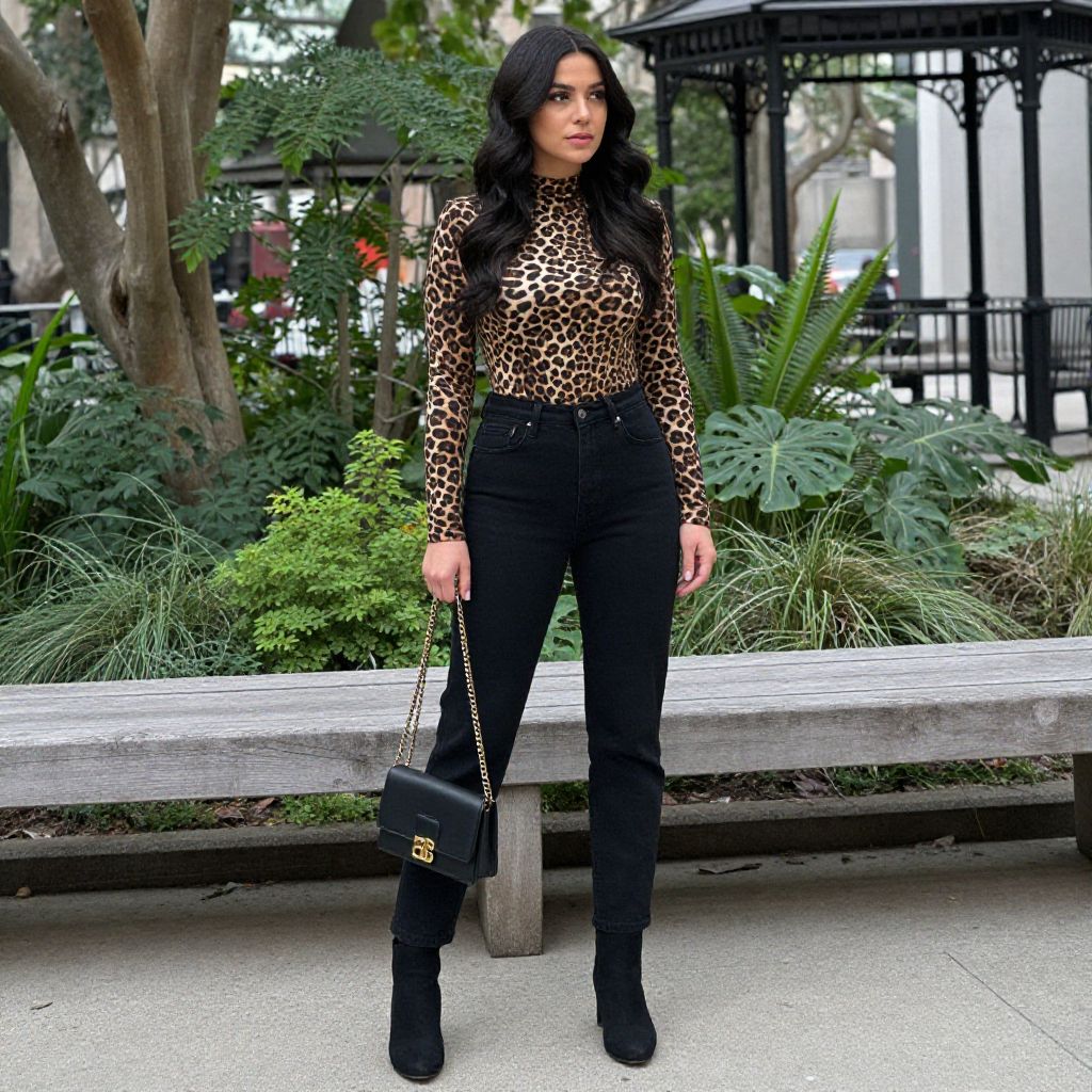 Photograph of a stylish woman standing in an urban park. She has long, dark wavy hair and is wearing a leopard-print, long-sleeve top with high-waisted black jeans and black ankle boots. She carries a small black handbag with a gold chain. The background features lush green plants, a wooden bench, and a black iron gazebo. The overall vibe is chic and fashionable.
