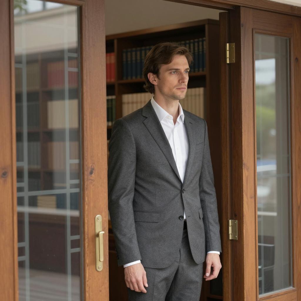 Man with medium-length brown hair, white polo shirt, beige cardigan, and gray pants stands in a lush garden. His arms are outstretched, and he has a slightly open mouth. Green hedges and trees fill the background. Sunlight filters through the trees. He is centered in the frame.