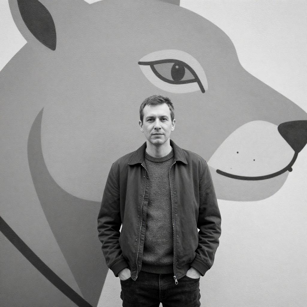 Black-and-white photograph of a man standing against a large, detailed mural. The man has a neutral expression, short hair, wearing a dark jacket over a sweater, hands in pockets. The mural depicts a large, abstract animal face. The man is centered, the mural fills the background.