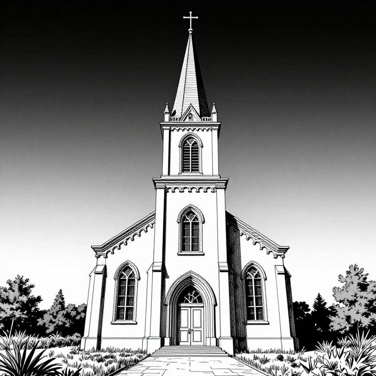 Black-and-white digital drawing of a Gothic-style church with a tall spire, arched windows, and cross on the roof, set against a gradient