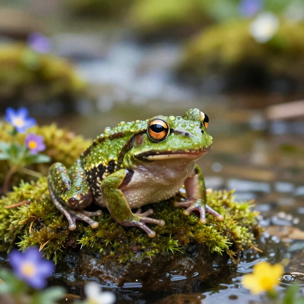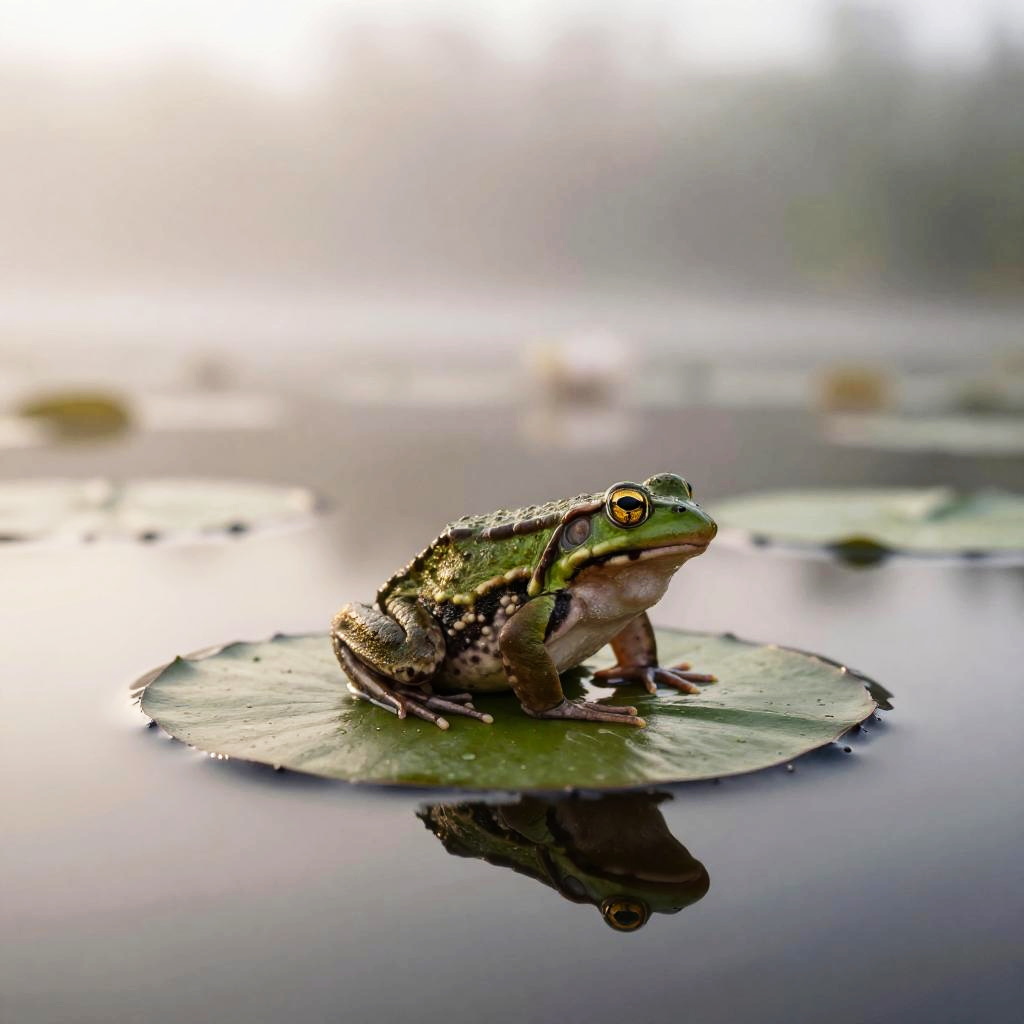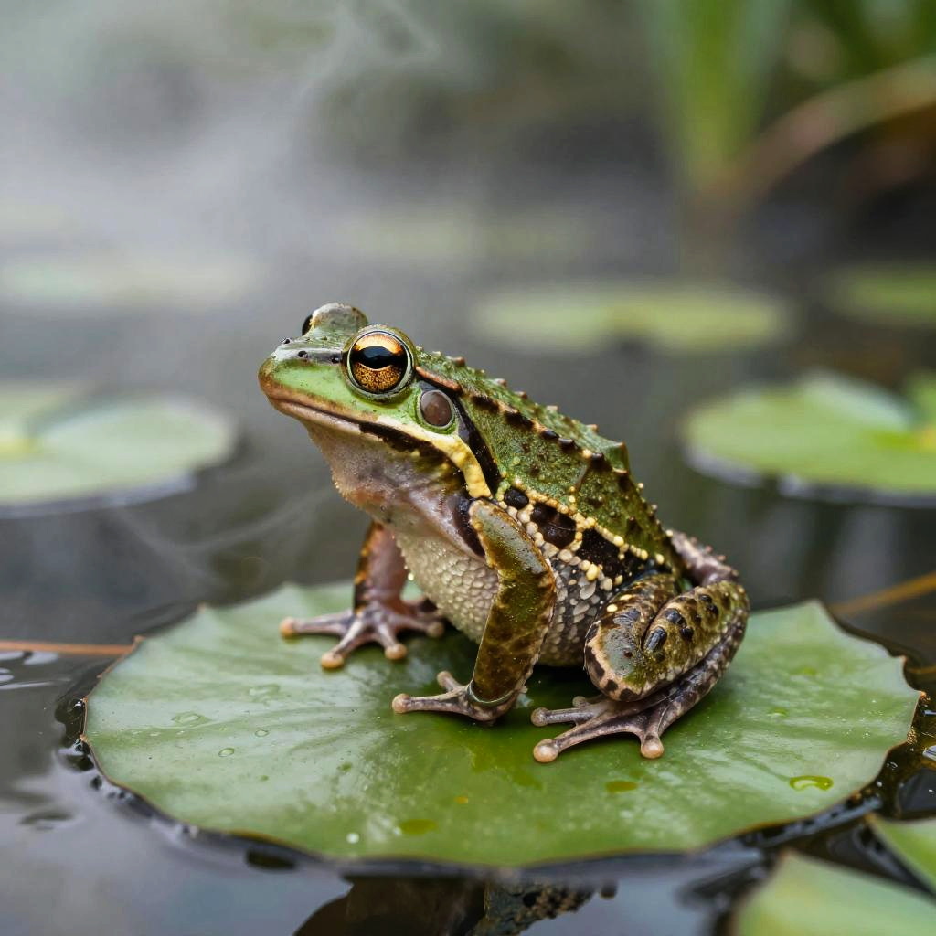 Long neck frog perched atop a vibrant green lily pad in a mystical swamp, early morning mist swirling around, hyper-realistic with intricate skin textures and bright reflective eyes, soft natural lighting, fantasy art style.
