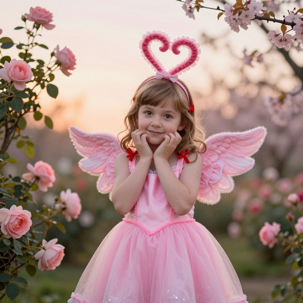 A detailed, naturalistic photo of a young girl in a pink cupid costume, with small cupid-style wings on her shoulders, a heart-shaped headpiece, and a red ribbon tied around her head, posing in a whimsical garden at sunset with pink roses and cherry blossoms surrounding her.