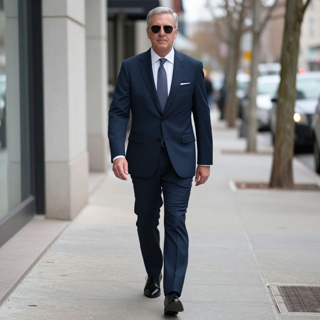 Smart Formal Costume, man in a suit walking down a sidewalk in a city
