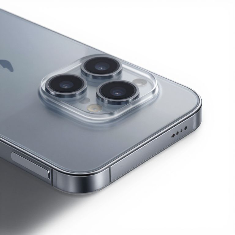 A close-up of a sleek smartphone with a transparent case, showing the internal components, set against a minimalist white background.