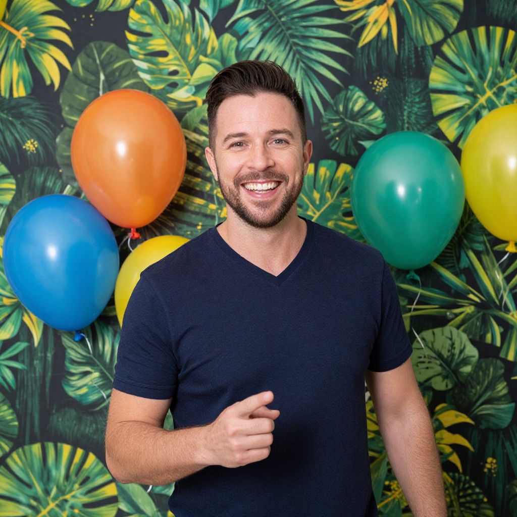 A man with a cheerful smile is captured in a festive mood, surrounded by a vibrant backdrop of tropical foliage and lively balloons, giving off an artistic and celebratory vibe.