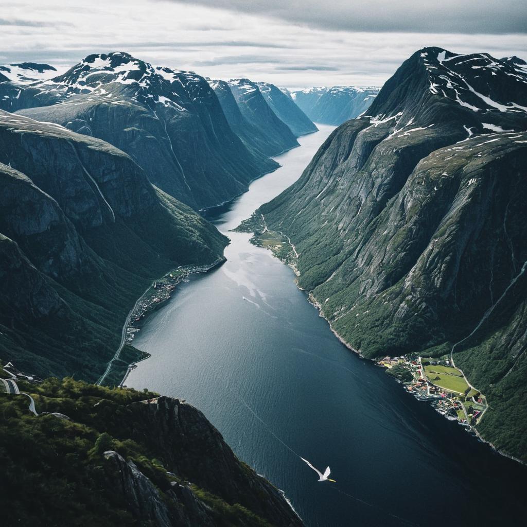 Bird's eye view over the fjords of Norway, atmospheric perspective, high detail, realistic, natural lighting