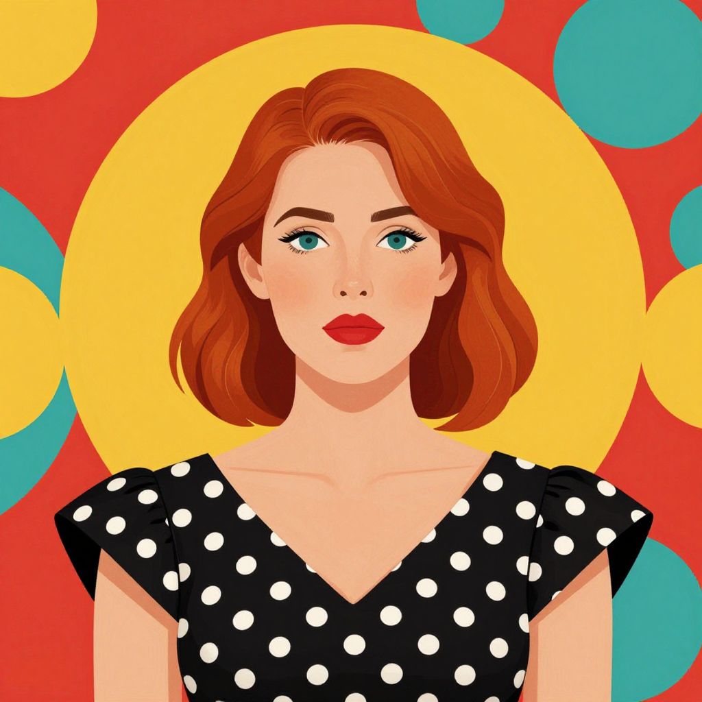 A stylized portrait of a woman with red hair and a polka-dotted dress, set against a vibrant background of circles in red, yellow, and teal.
