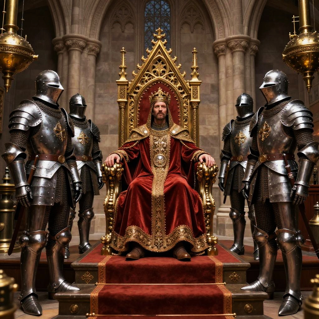 Steampunk medieval royal throne room, grand stone hall decorated with brass fixtures and steam machinery, knights in steam-powered armor guarding a noble figure on an ornately carved throne blending gothic and mechanical design, rich colors and intricate textures.