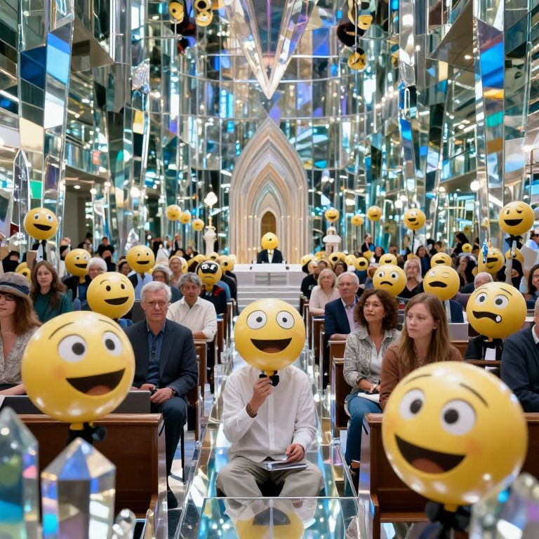 Photograph of a modern, mirrored church interior filled with yellow, smiling emoji balloons hanging from the ceiling. A diverse crowd, including men and women of various ages and ethnicities, sits in wooden pews. The central focus is an older man in a white shirt, holding a microphone, speaking to the audience. The background features a tall, pointed archway, illuminated by reflected lights, creating a vibrant, contemporary atmosphere. The overall scene blends traditional religious elements with modern, digital influences.