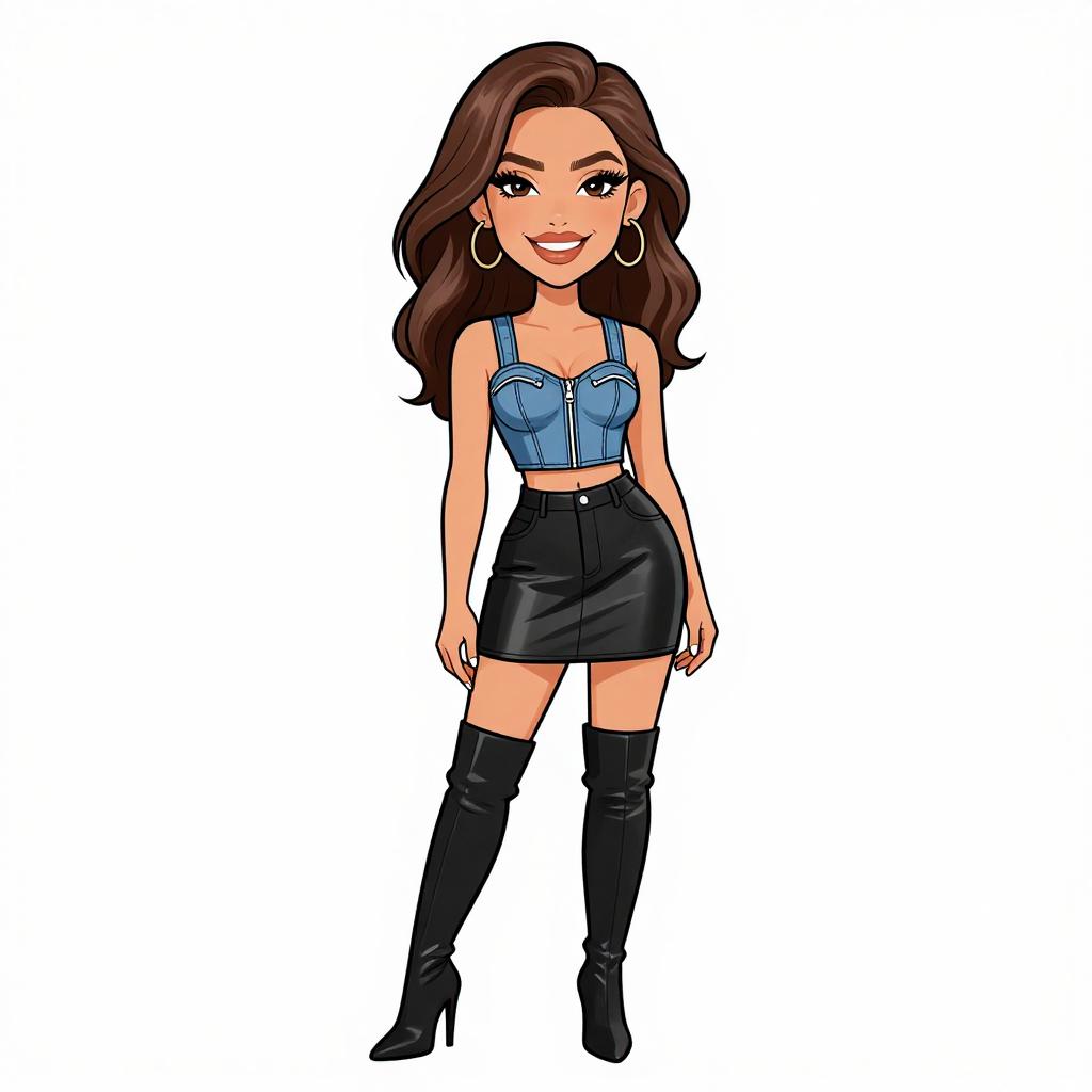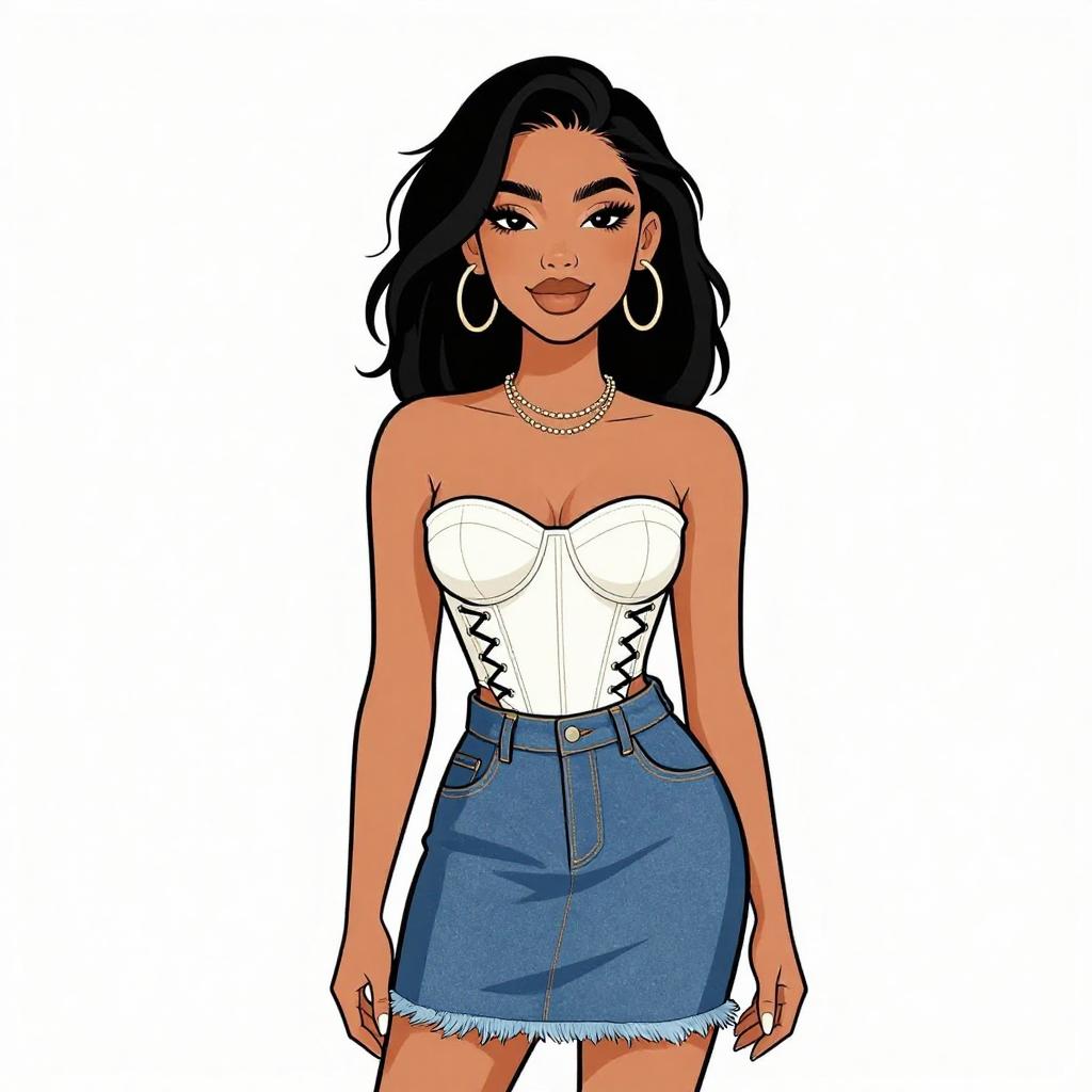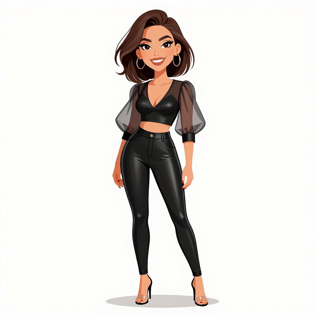 Woman with pretty face and pretty hair. smiling Woman, edgy glam, black faux leather lace-up corset top, sweetheart neckline, sleeveless, high-waisted black skinny jeans, white background. --sref 1467