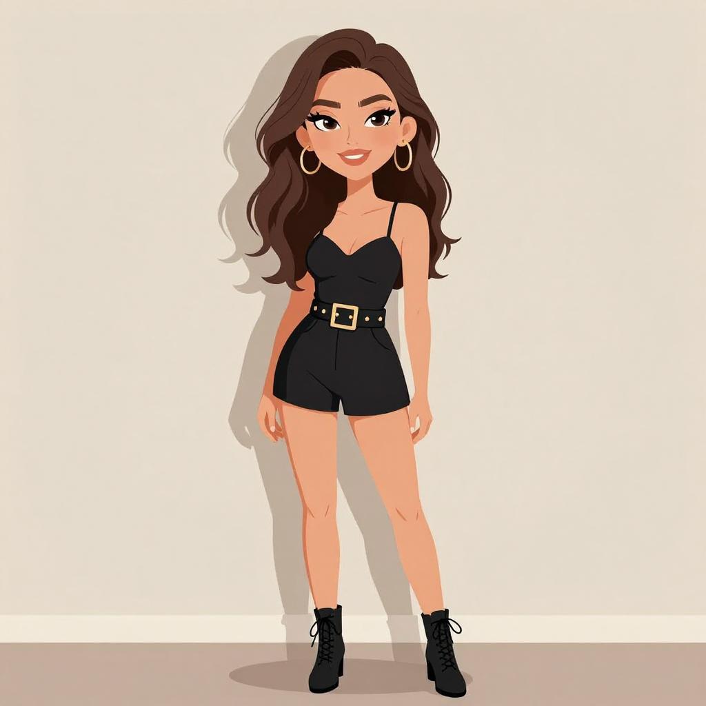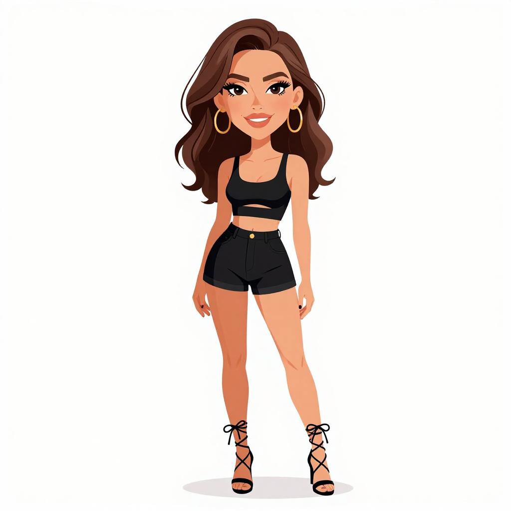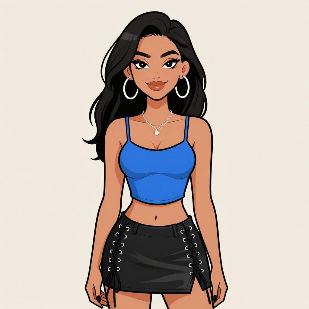 Woman with pretty face and pretty hair. smiling Woman, edgy glam, black faux leather lace-up corset top, sweetheart neckline, sleeveless, high-waisted black skinny jeans, white background. --sref 1467