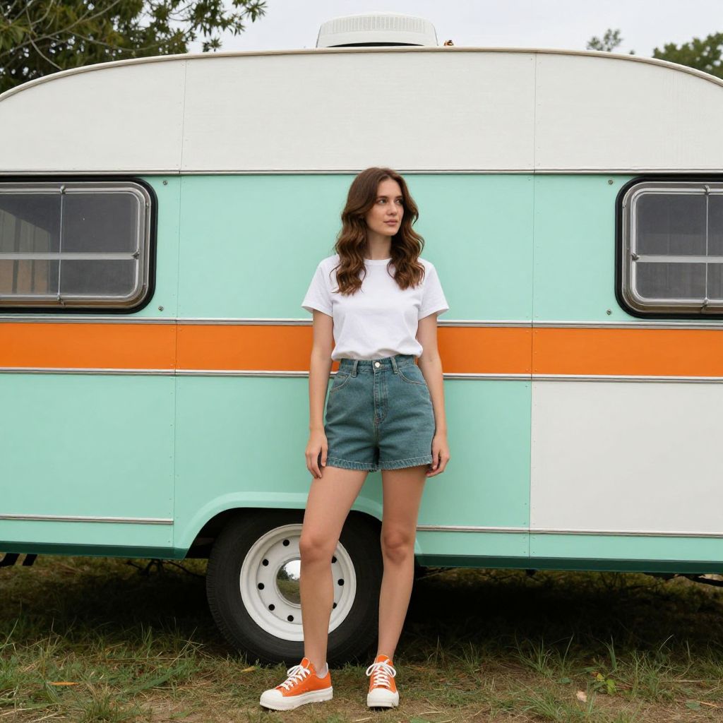 Woman standing beside a vintage travel trailer featuring retro-inspired color blocking with mint green, orange, and white panels, showcasing a charming and nostalgic aesthetic.