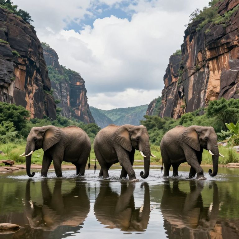 Photograph of three African elephants walking in a reflective river, surrounded by towering, rocky cliffs and lush greenery under a cloudy sky.