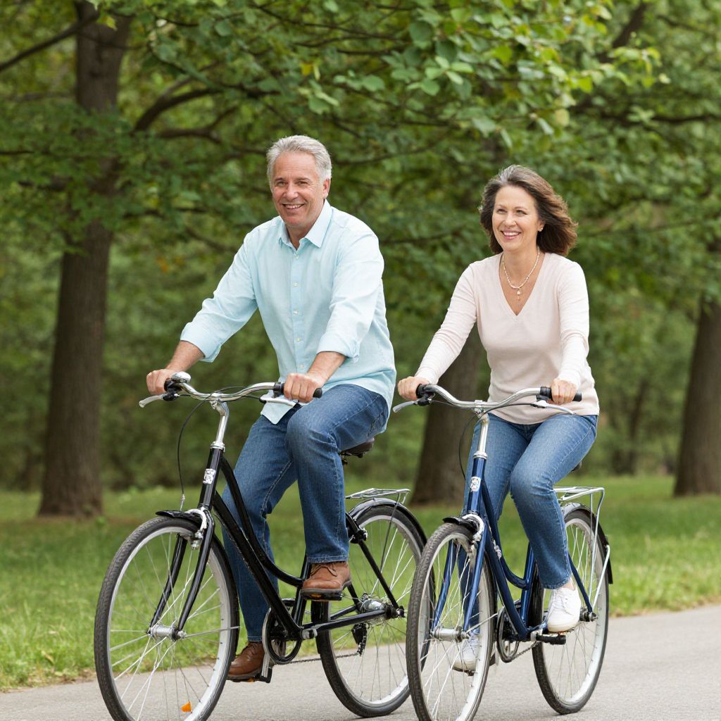 Photograph of a smiling middle-aged couple riding black bicycles on a park path, with lush green trees in the background.