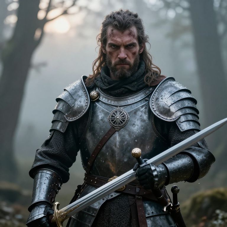A highly detailed close-up of a warrior in full medieval armor clothing, standing in a misty forest at dawn, the armor glistening with dew, face rugged and weathered with a stern expression, hair tied back with a leather cord, holding a long sword in one hand