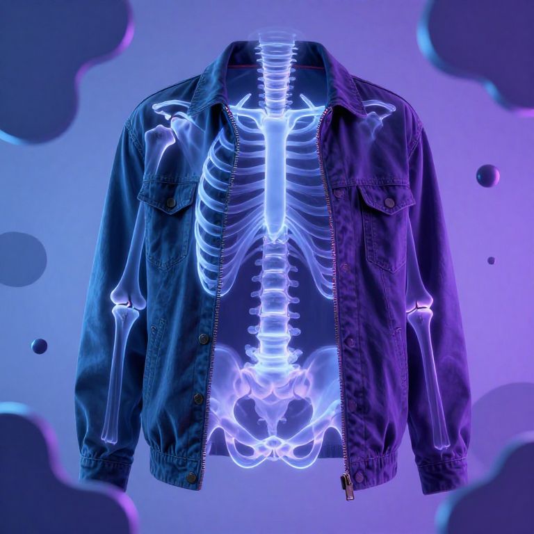 Photorealistic digital art: glowing blue skeletal outline on a dark blue denim jacket, with purple and blue background and floating shapes.