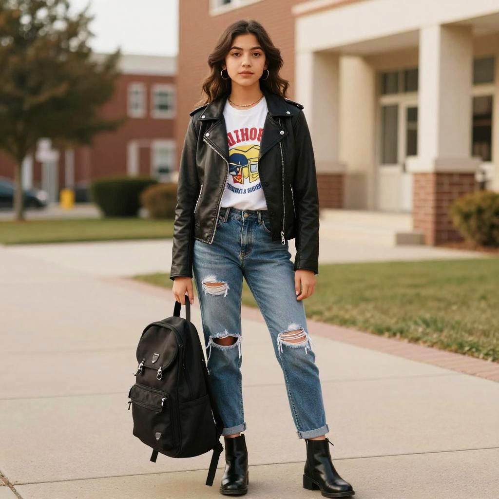 Western outfits for school girl, modern chic style with leather jacket, graphic tee, ripped jeans, ankle boots, backpack, urban school campus, warm afternoon light