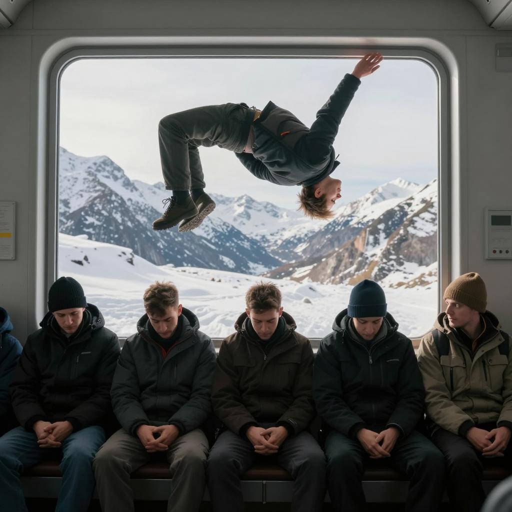 A plane interior with a snowy mountain landscape outside. Six men sit in the foreground, looking downward. One man is mid-air, upside down, outside the plane window. Men wear dark and light clothing, some with hats. Snow-covered peaks visible through the window. Bright daylight outside contrasts with the dim interior.