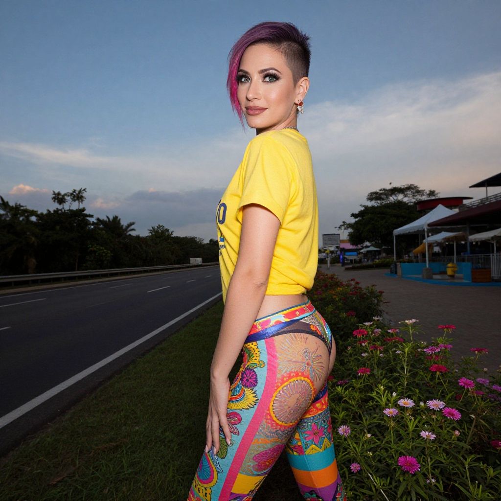 Photograph of a confident woman with purple-hued short hair, yellow top, and vibrant, colorful, sheer leggings, standing on a roadside at dusk