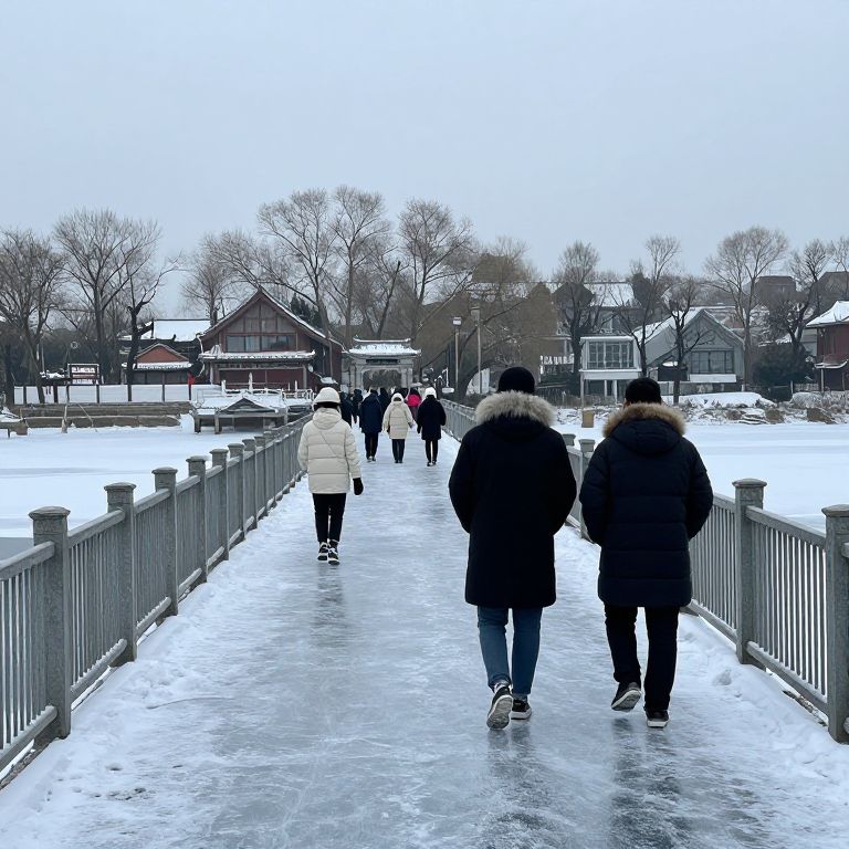 Photograph of a snowy, icy pedestrian bridge with a grey railing. Six people, dressed in winter coats and boots, walk away from the camera. The foreground shows two individuals in dark coats with fur-lined hoods, while others wear lighter-colored jackets. Bare trees and snow-covered houses are visible in the background. The sky is overcast, creating a cold, wintry atmosphere. The bridge's icy surface reflects the overcast light, adding a slick texture to the scene.